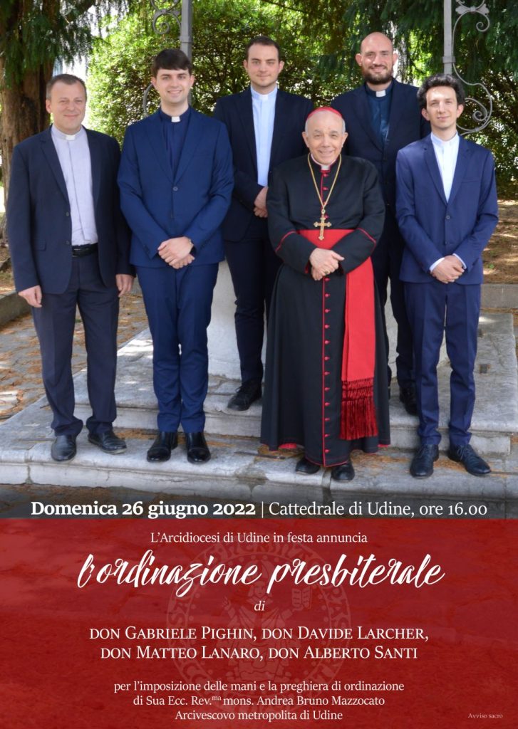 Nel manifesto: l’Arcivescovo mons. Andrea Bruno Mazzocato assieme ai quattro ordinandi e al rettore del seminario don Loris Della Pietra.